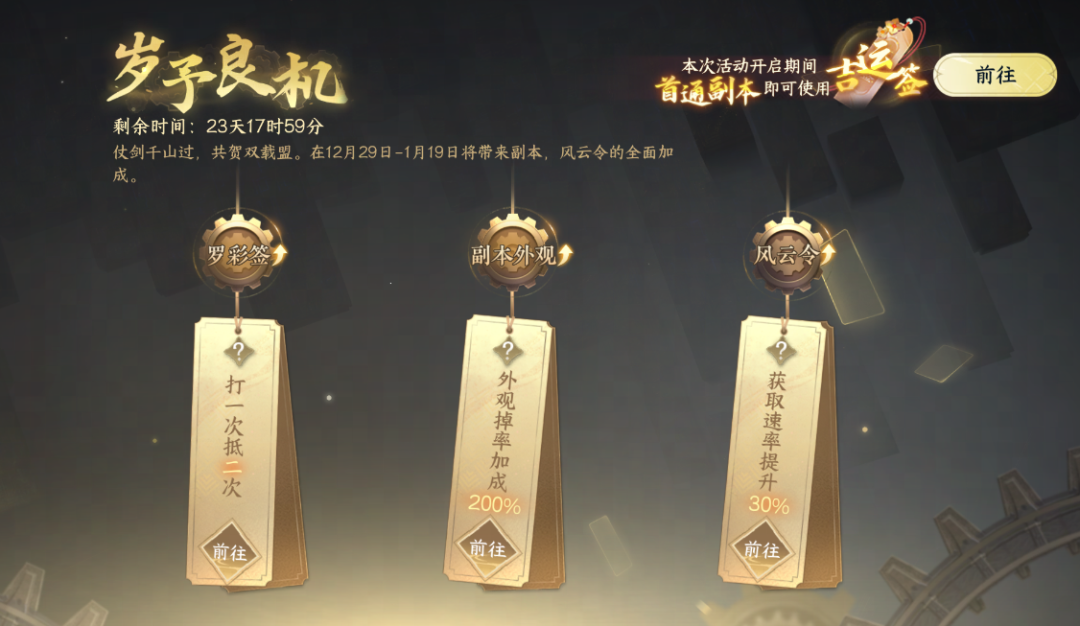 罗彩签打一抵二,副本外观掉率 200%,风云令获取速度提升 30%,首通 boss 即可使用吉运签。