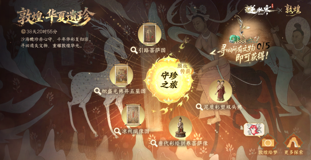 逆水寒 x 敦煌联动活动开启。寻回遗失文物,重耀敦煌华光。接取寻境任务《照夜传薪》,开启敦煌守珍之旅,寻回全部文物可获得配饰・面饰:青羽梵面、888 绑玉。