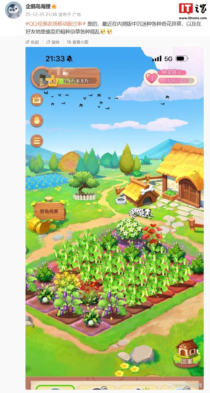 腾讯工作人员 @企鹅岛海狸 今日分享了《QQ 经典农场》手游内测版相关内容,包括游戏画面、部分玩法等。据介绍,内测版可以种植各种奇花异草,并支持在好友地里偷菜扔蛆种杂草各种捣乱。