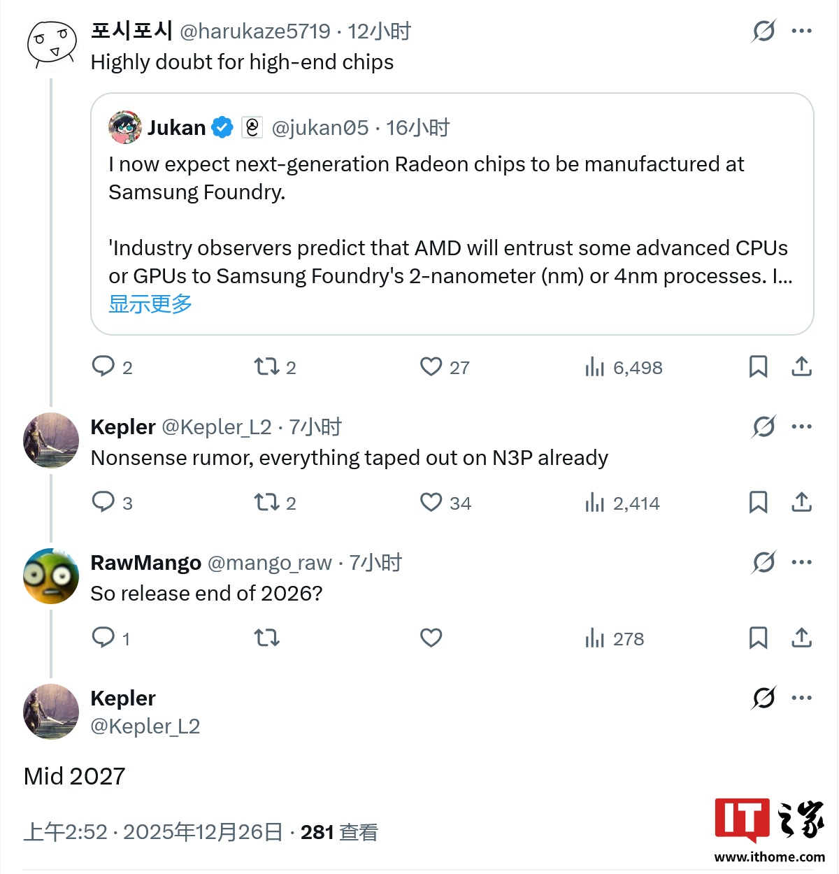 IT之家 12 月 26 日消息,消息人士 @Kepler_L2 在参与 X 平台上有关 AMD 与三星潜在合作可能的讨论时表示,AMD 的下一代 Radeon GPU 芯片已在台积电 N3P 工艺制程节点完成流片,预计在 2027 年中(IT之家注:应即当年的 COMPUTEX 台北国际电脑展上)发布。