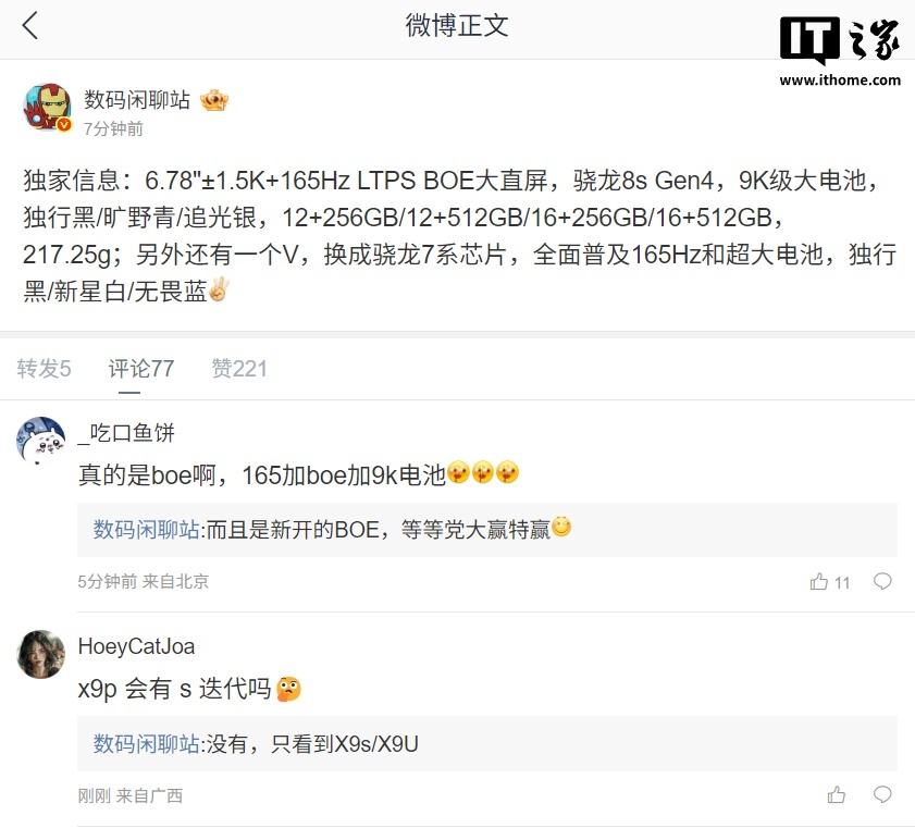 据IT之家此前援引博主 @数码闲聊站 消息,某厂新机将搭载京东方 6.78"±1.5K+165Hz LTPS 大直屏,拥有高通骁龙 8s Gen4 芯片,配备“9K 级大电池”,可选独行黑 / 旷野青 / 追光银三种配色,重量 217.25g,预计为一加 Turbo 系列。