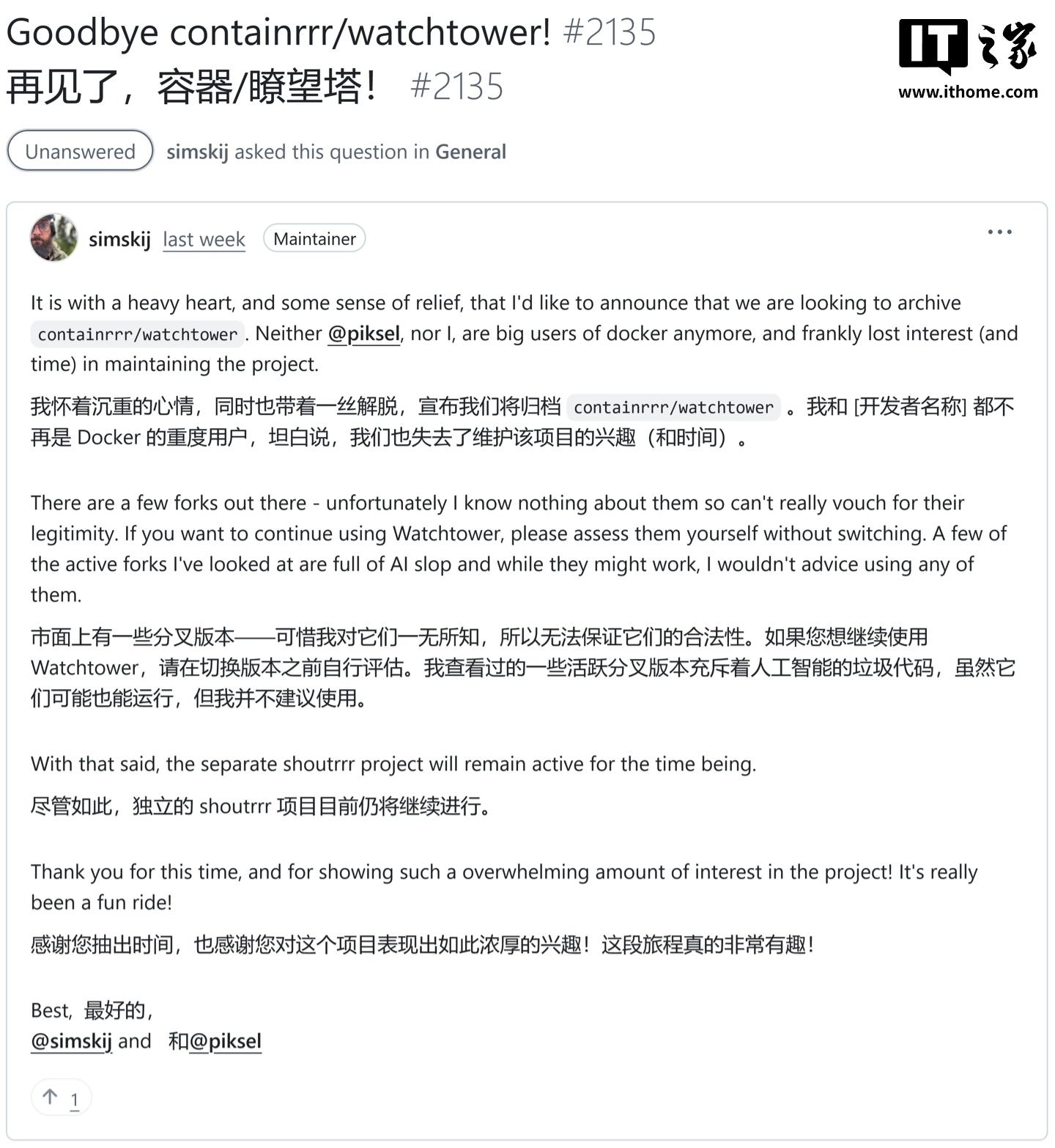 维护团队表示,做出这一决定既沉重又释然。由于核心成员 Piksel 和发帖者 Simon Aronsson 已不再是 Docker 的重度用户,随着时间推移,他们逐渐失去了维护项目的兴趣与精力。为避免项目陷入“僵尸维护”的尴尬状态,团队最终决定将其正式归档,明确告知社区这一现状。