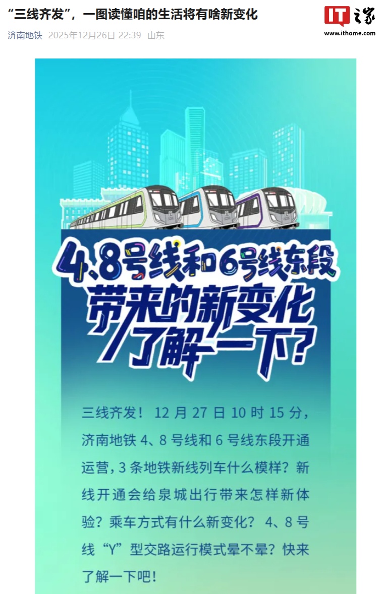 IT之家 12 月 27 日消息,据济南地铁官方公众号消息,今日 10 时 15 分,济南地铁 4、8 号线和 6 号线东段开通运营,实现三线齐发。