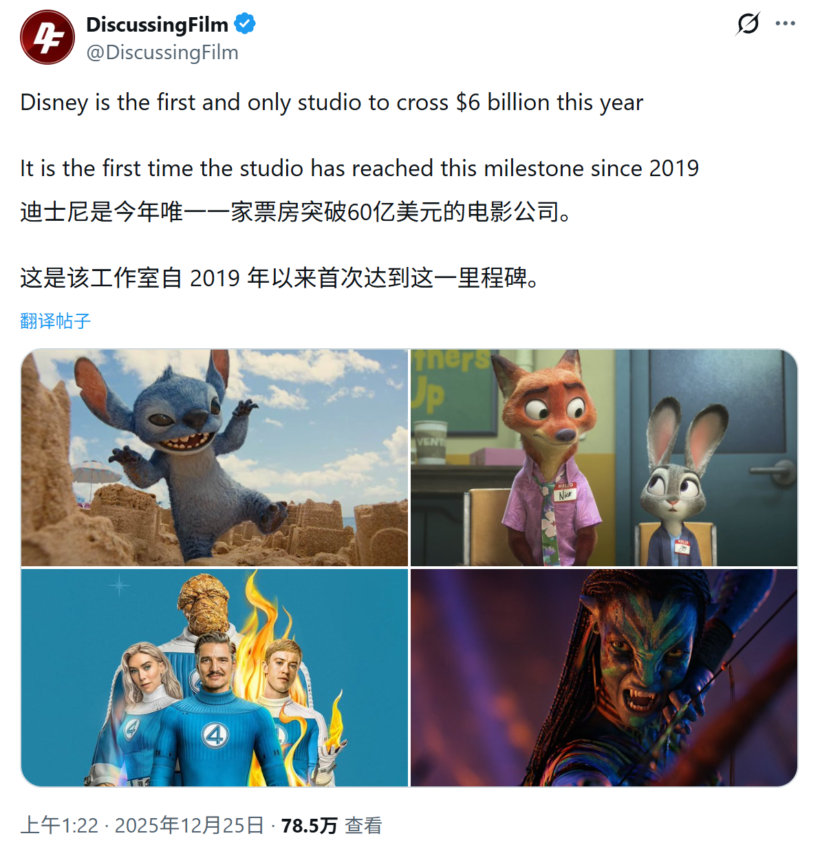 IT之家 12 月 27 日消息,Variety 于 12 月 24 日发布博文,报道称迪士尼 2025 年全球票房收入突破 60 亿美元(IT之家注:现汇率约合 420.99 亿元人民币),是迪士尼历史上第五次达成这一成就,也是自 2019 年新冠疫情以来首次站上该里程碑。