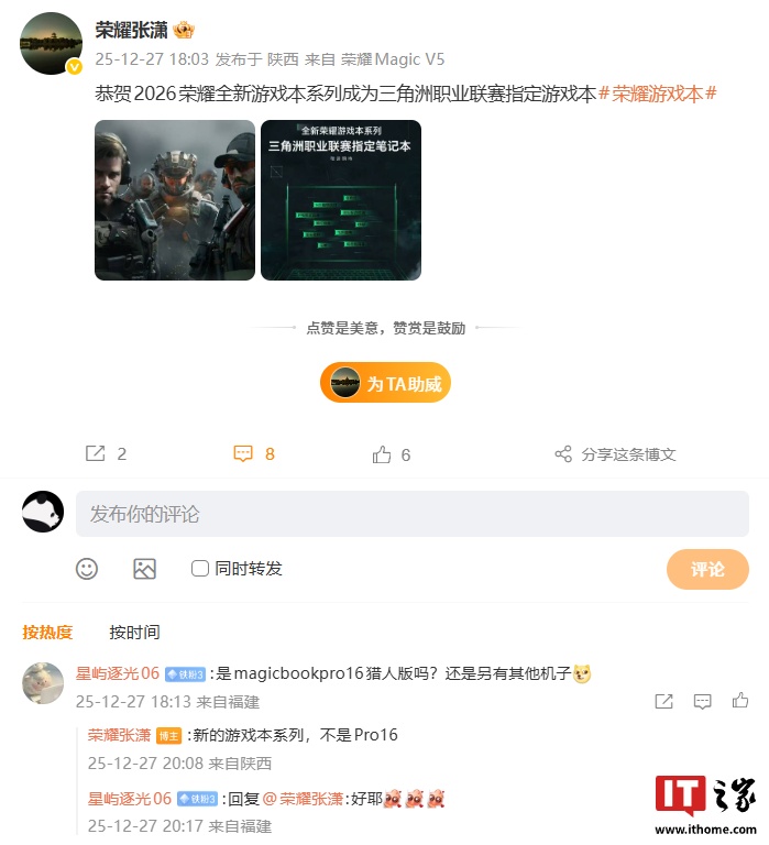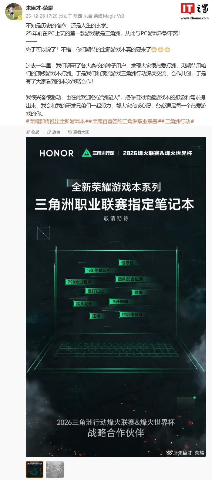 IT之家 12 月 28 日消息,据荣耀终端股份有限公司 PC 产品总经理 @朱臣才-荣耀 分享,荣耀全新游戏本即将发布(具体发布时间暂未公布)。朱臣才分享的预热海报显示,新品也是《三角洲行动》职业联赛指定笔记本。