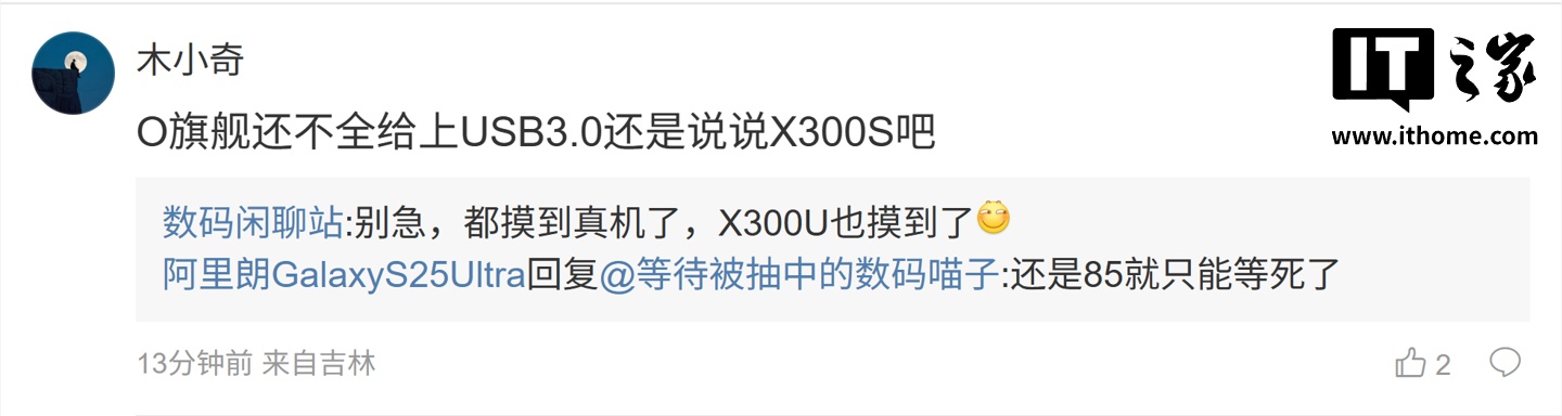 后续有用户在评论区表示:“O 旗舰还不全给上 USB3.0 还是说说 X300S 吧”,博主回复道:“别急,都摸到真机了,X300U 也摸到了