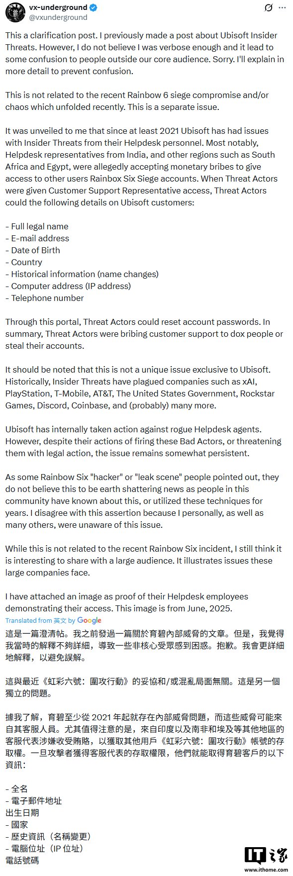 IT之家 12 月 29 日消息,网络安全机构 VX Underground 今天在 X 平台发文称,育碧的客服体系存在巨大漏洞,可被别有用心之人盯上,进而利用社会工程学获取玩家的账号信息。
