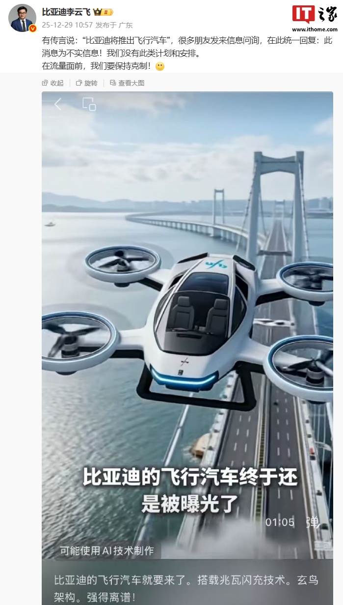 IT之家 12 月 29 日消息,比亚迪集团-品牌及公关处总经理李云飞今日发文回应了“比亚迪将推出飞行汽车”的传言,称此消息为不实信息。