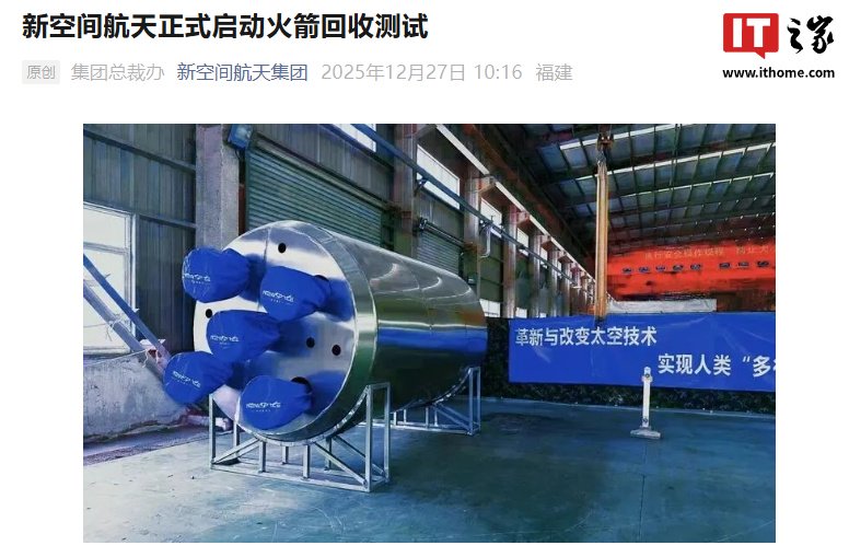IT之家 12 月 29 日消息,我国民营火箭公司“新空间航天”在 12 月 27 日宣布,正式启动赤兔 1 号运载火箭回收与重复使用关键技术工程测试(赤兔 1 号运载火箭发动机舱直径 2.25 米,高 4.5 米),意味着新空间航天在“低成本、高可靠、可重复使用”航天技术路线上的核心能力正在加速落地。