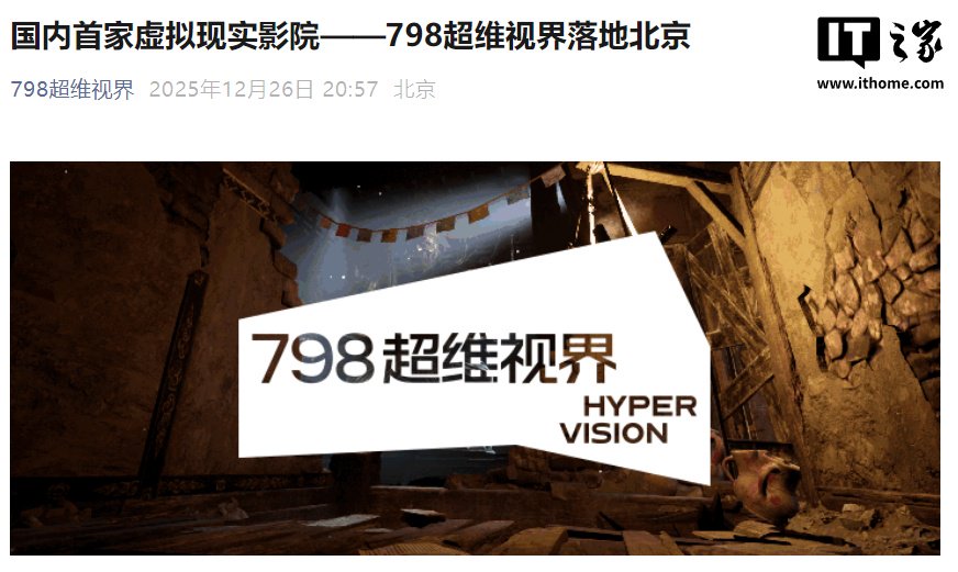 IT之家 12 月 29 日消息,“光影焕新・启幕未来 —— 北京影院新空间暨电影跨年活动发布会”于上周五在北京 798 超维视界举行。发布会上,国内首家虚拟现实(VR)影院 —— 798 超维视界正式对外公布。