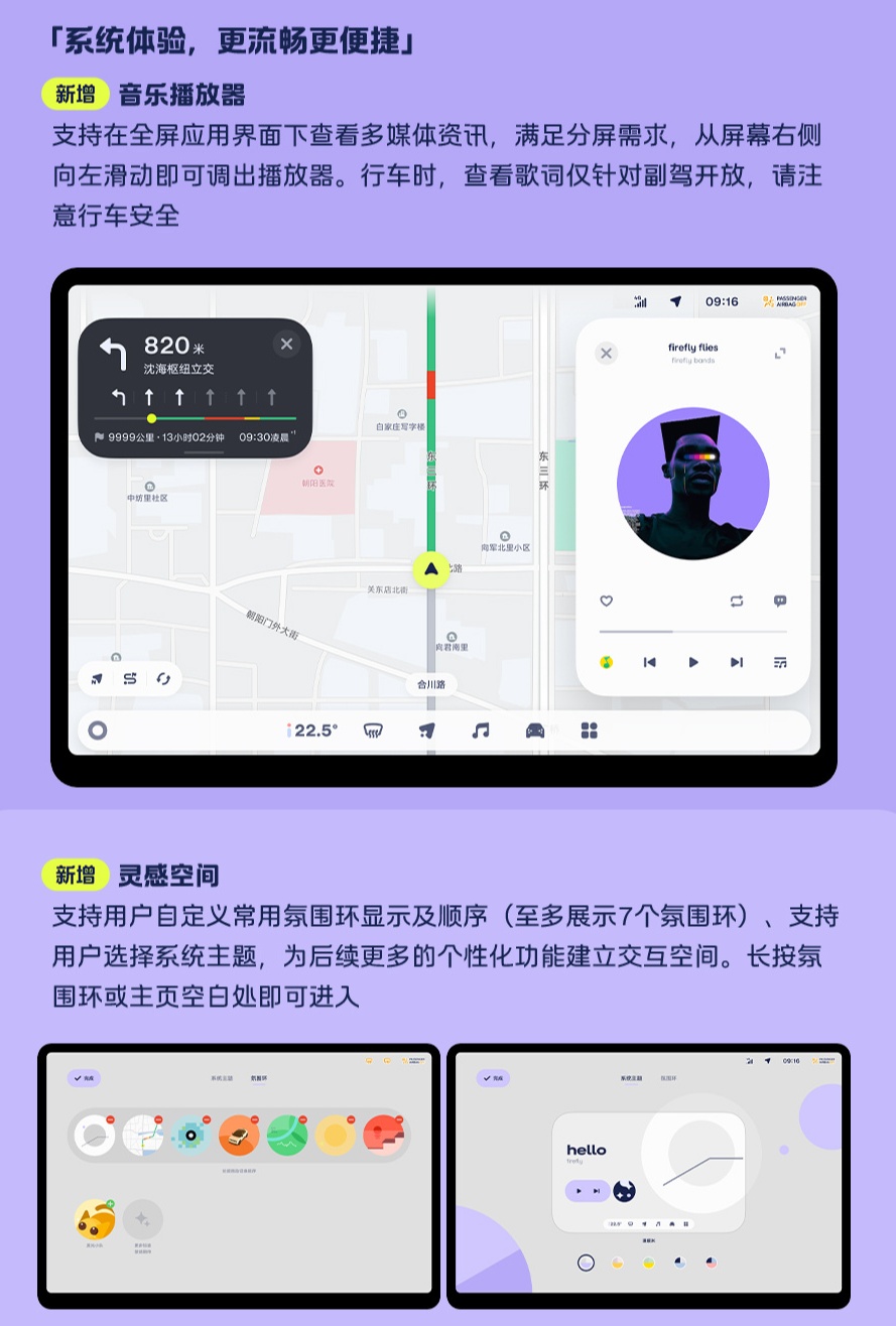 新增 lumo 随动:开启该功能后,lumo 将联动氛围灯,针对主驾与副驾唤醒 lumo 时,氛围灯将会根据双音区灵活移动并进行实时的氛围渲染,给予用户唤醒提示