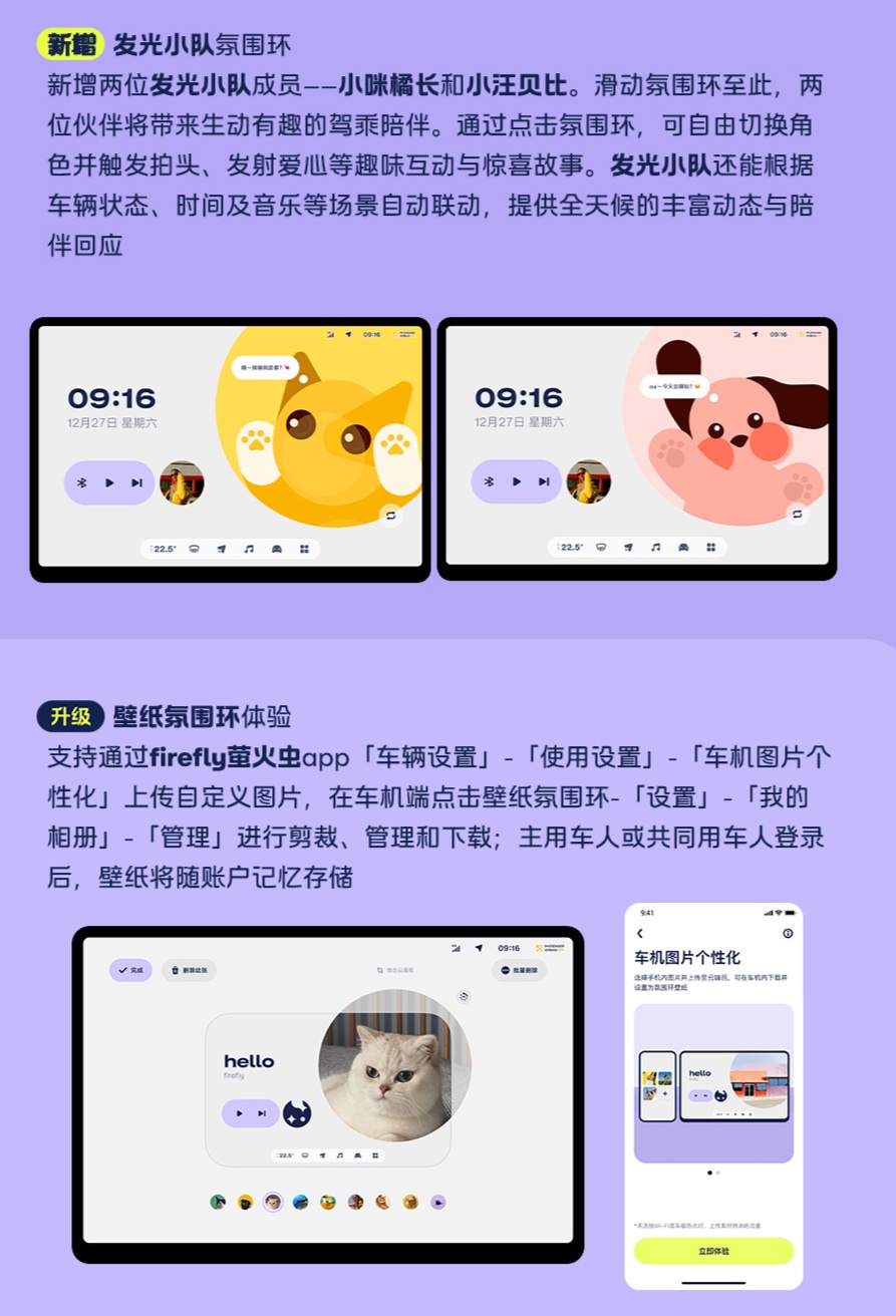 新增两位发光小队成员 —— 小咪橘长和小汪贝比。滑动氛围环至此,两位伙伴将带来生动有趣的驾驶陪伴。通过点击氛围环,可自由切换角色并触发拍头、发射爱心等趣味互动与惊喜故事。发光小队还能根据车辆状态、时间及音乐等场景自动联动,提供全天候的丰富动态与陪伴回应。
