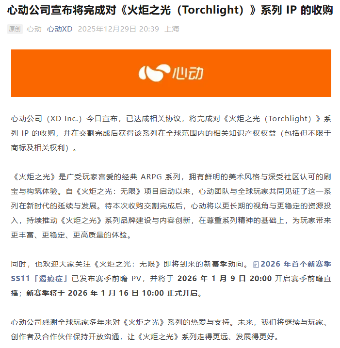 官方称,《火炬之光》是广受玩家喜爱的经典 ARPG 系列,拥有鲜明的美术风格与深受社区认可的刷宝与构筑体验。自《火炬之光:无限》项目启动以来,心动团队与全球玩家共同见证了这一系列在新时代的延续与发展。待本次收购交割完成后,心动将以更长期的视角与更稳定的资源投入,持续推动《火炬之光》系列品牌建设与内容创新,在尊重系列精神的基础上,为玩家带来更丰富、更稳定、更高质量的体验。