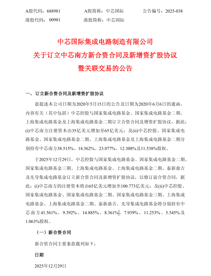 另外,中芯国际还发布公告,公司全资子公司中芯国际控股有限公司与国家集成电路基金等多家国家及地方集成电路基金订立新协议,对中芯南方集成电路制造有限公司进行增资扩股。增资完成后,中芯控股持有中芯南方股权将由 38.515% 增至 41.561%。