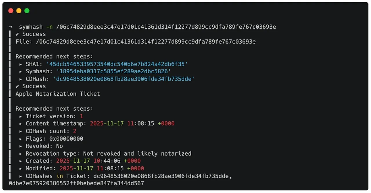 在对 Mach-O 二进制文件进行分析后,研究人员确认该程序为通用架构构建,并已完成代码签名和公证,其签名关联的开发者团队 ID 为 GNJLS3UYZ4。同时,Jamf 将代码目录哈希值与苹果的吊销列表进行了比对,在分析时并未发现相关证书被吊销。
