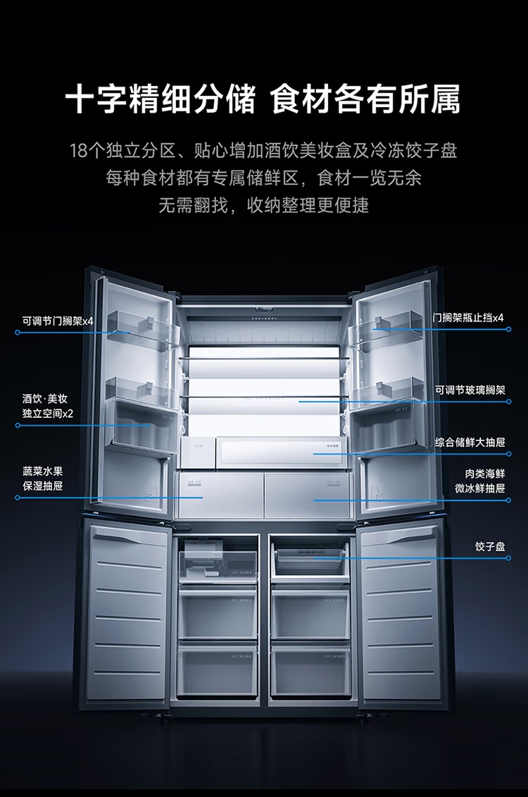 此外,它还支持米家微冰鲜,双系统独立控温,肉类零下鲜存 10 天不冻结;支持全自动制冰,全链路抗菌认证;全域离子净化 2.0,大肠杆菌去除率超 99.999%。IT之家附参数详情如下: