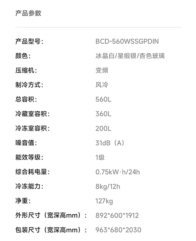 这款冰箱提供了冰晶白、星锻银、杏色玻璃三种配色可选,支持 60cm 超薄平嵌、十字精细分储;支持超一级能效,号称“全年节省约 3 个月冰箱电费”;支持 NFC 功能,食材临期提醒。