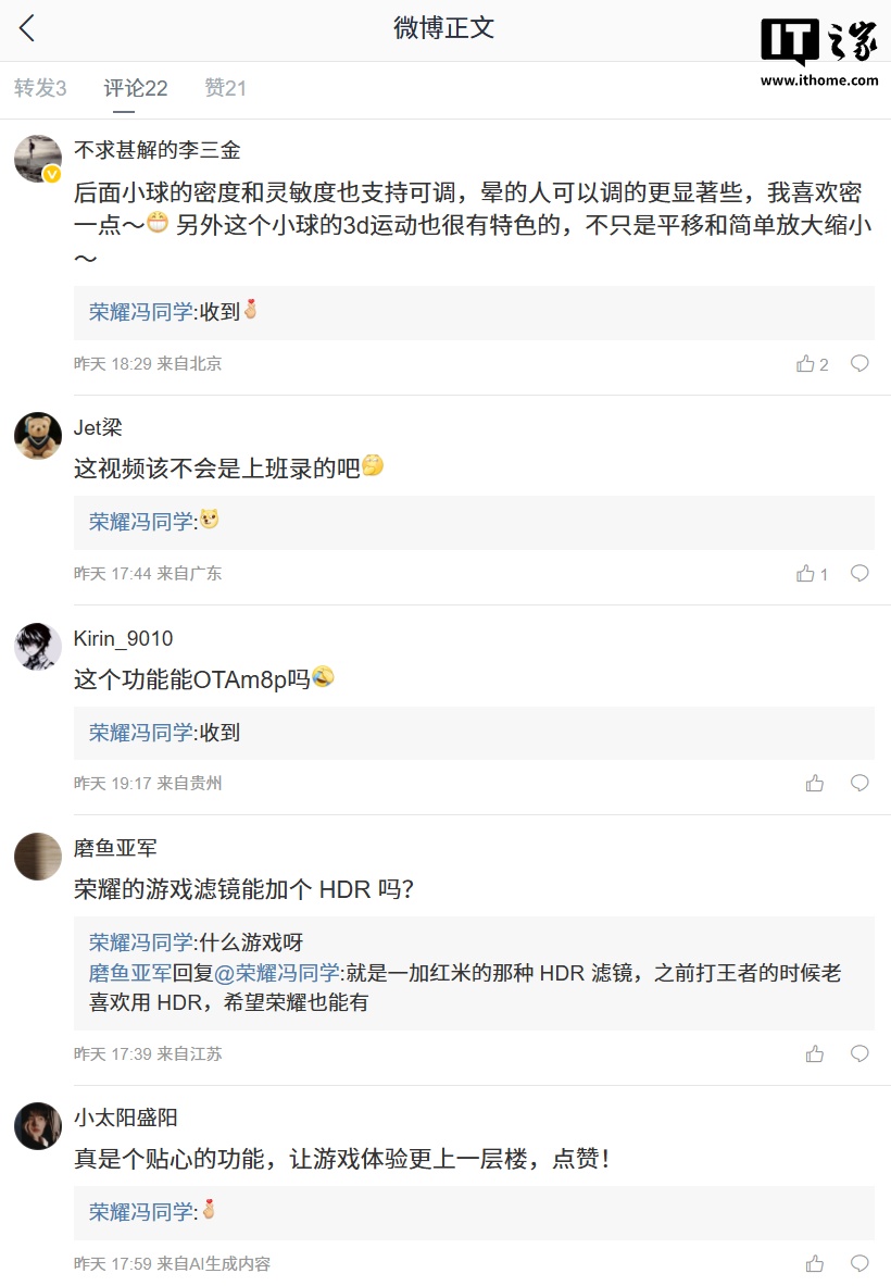 IT之家 12 月 31 日消息,荣耀游戏研发工程师 @荣耀冯同学 昨日发布视频,介绍了荣耀 WIN 系列手机的 3D 游戏晕动舒缓(行业独家)功能。他表示,该功能不仅缓解游戏晕动体验 56%,并且可以智能生成 3D 星空小球。