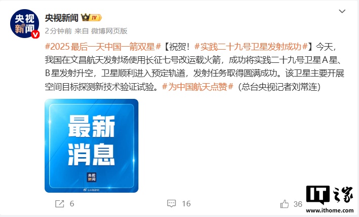 IT之家 12 月 31 日消息,据央视新闻报道,北京时间 2025 年 12 月 31 日 06 时 40 分,我国在文昌航天发射场使用长征七号改运载火箭,成功将实践二十九号卫星 A 星、B 星发射升空,卫星顺利进入预定轨道,发射任务取得圆满成功。该卫星主要开展空间目标探测新技术验证试验。