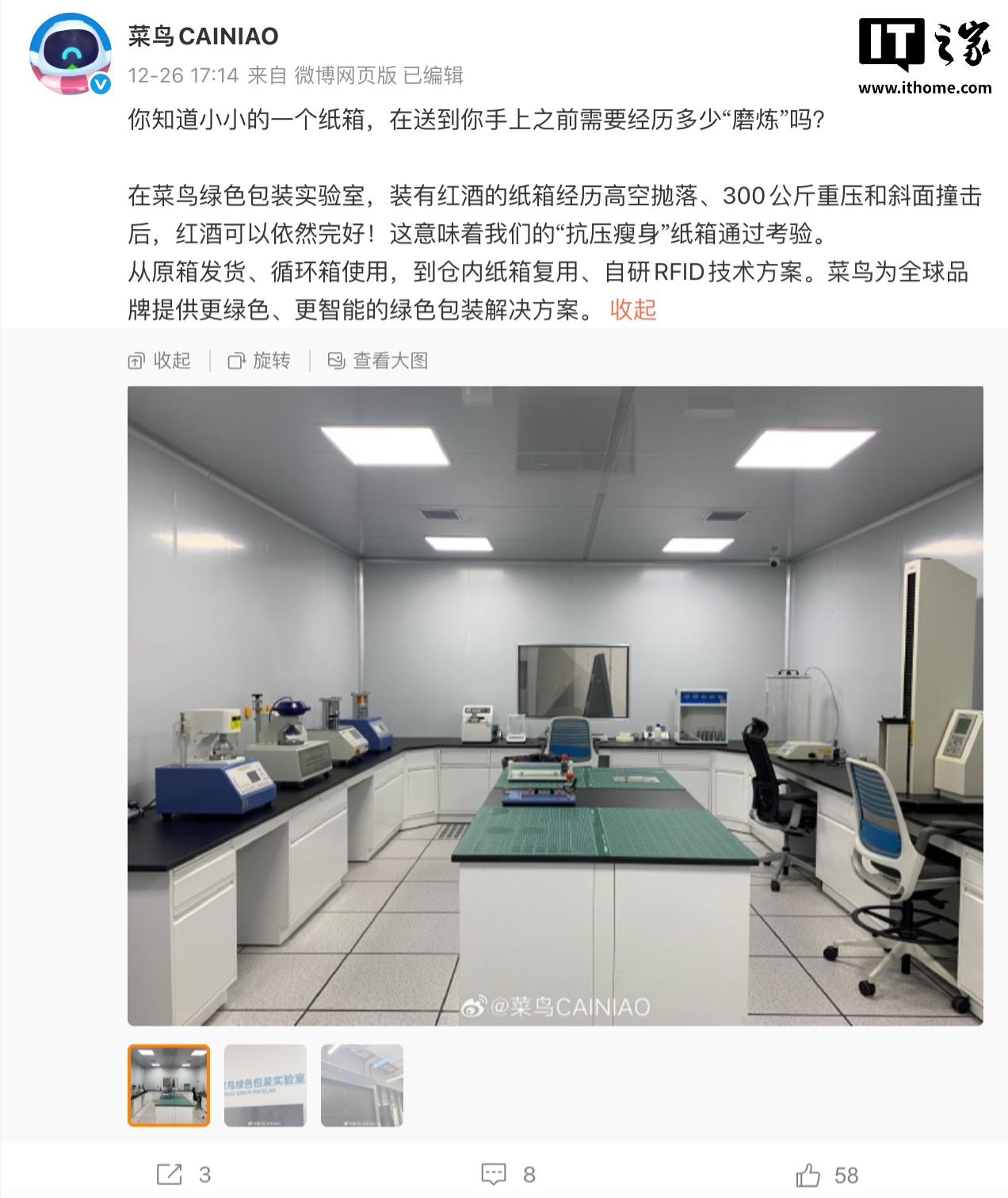 IT之家 12 月 31 日消息,据“菜鸟 CAINIAO”微博,菜鸟宣布旗下菜鸟绿色包装实验室研发出一款防摔抗压的快递纸箱,相应纸箱具有强度高、智能化特性。