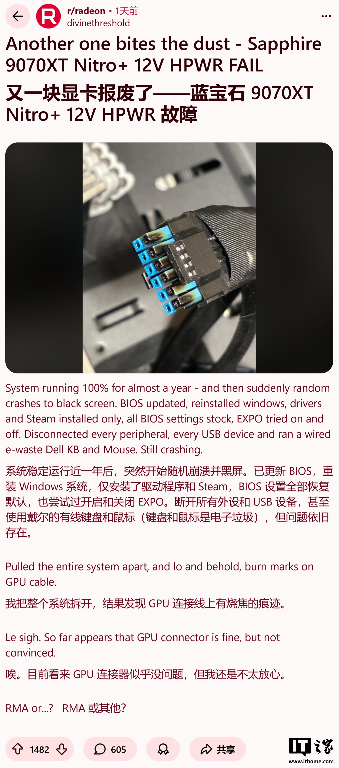 IT之家 12 月 31 日消息,网友 u/divinethreshold 昨日(12 月 30 日)在 Reddit 社区发帖,其使用了近九个月的蓝宝石 RX 9070 XT Nitro+ 显卡突然导致系统频繁黑屏崩溃。经检查发现,显卡的 16-pin 电源接口及转接线已严重烧毁,特别是顶部针脚完全熔化。