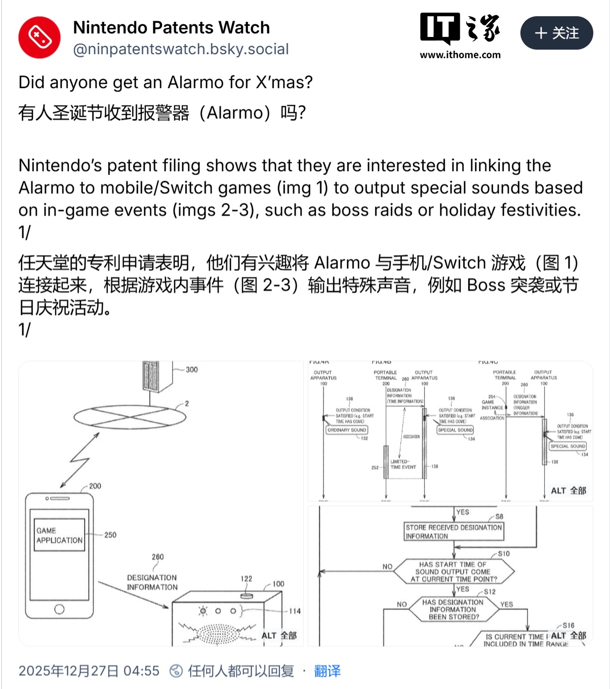 IT之家 12 月 31 日消息,科技媒体 Notebook Check 昨日(12 月 30 日)发布博文,基于任天堂最新获批的专利,描述了 Alarmo 闹钟配件可联动 Switch 2 掌机,接收来自游戏的实时通知。