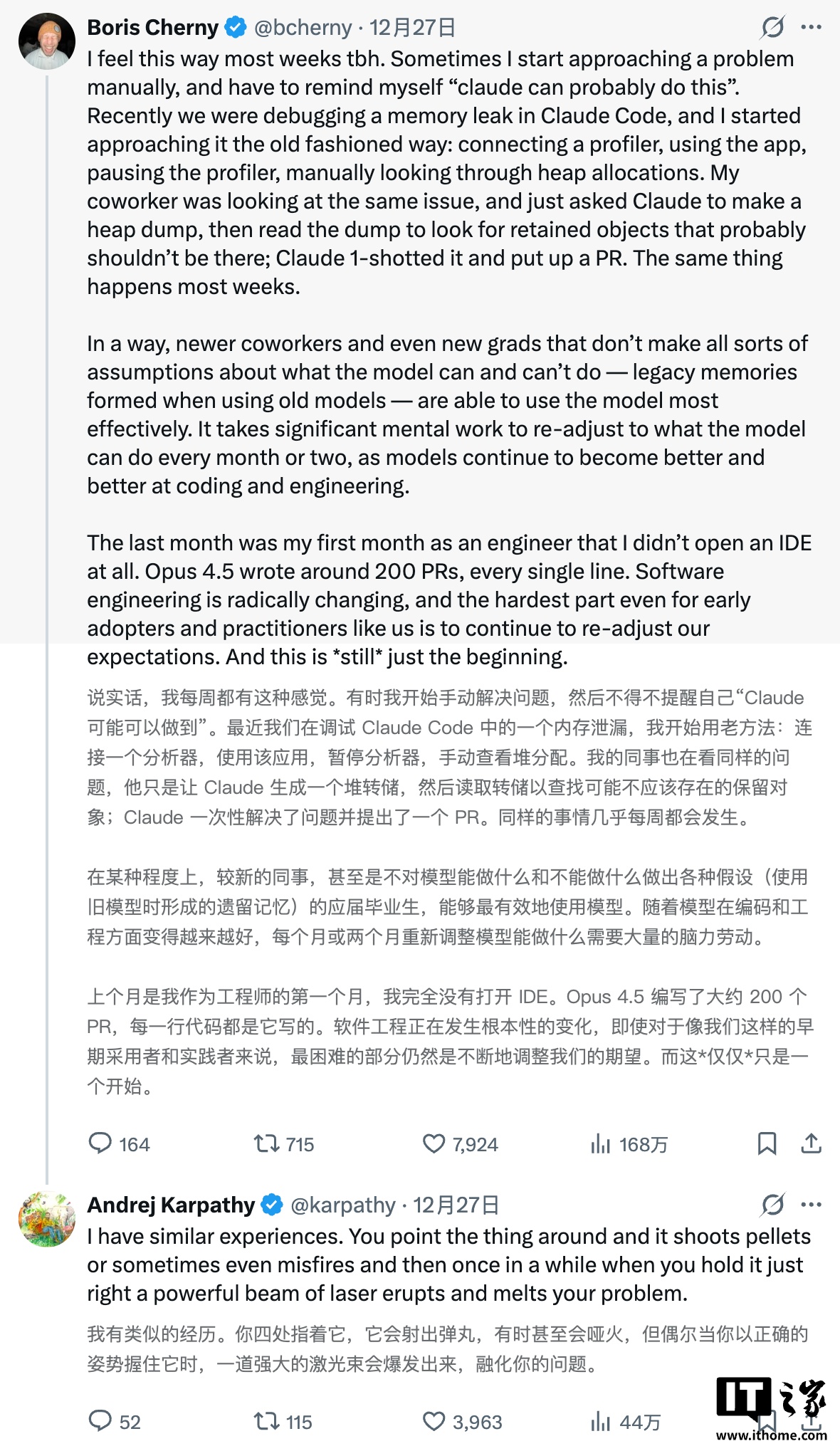 Anthropic 的 Claude Code 创建者鲍里斯・切尔尼也在评论中表示认同。他坦言,自己有时仍会按旧习惯手动解决问题,事后才意识到 AI 其实可以更快完成。