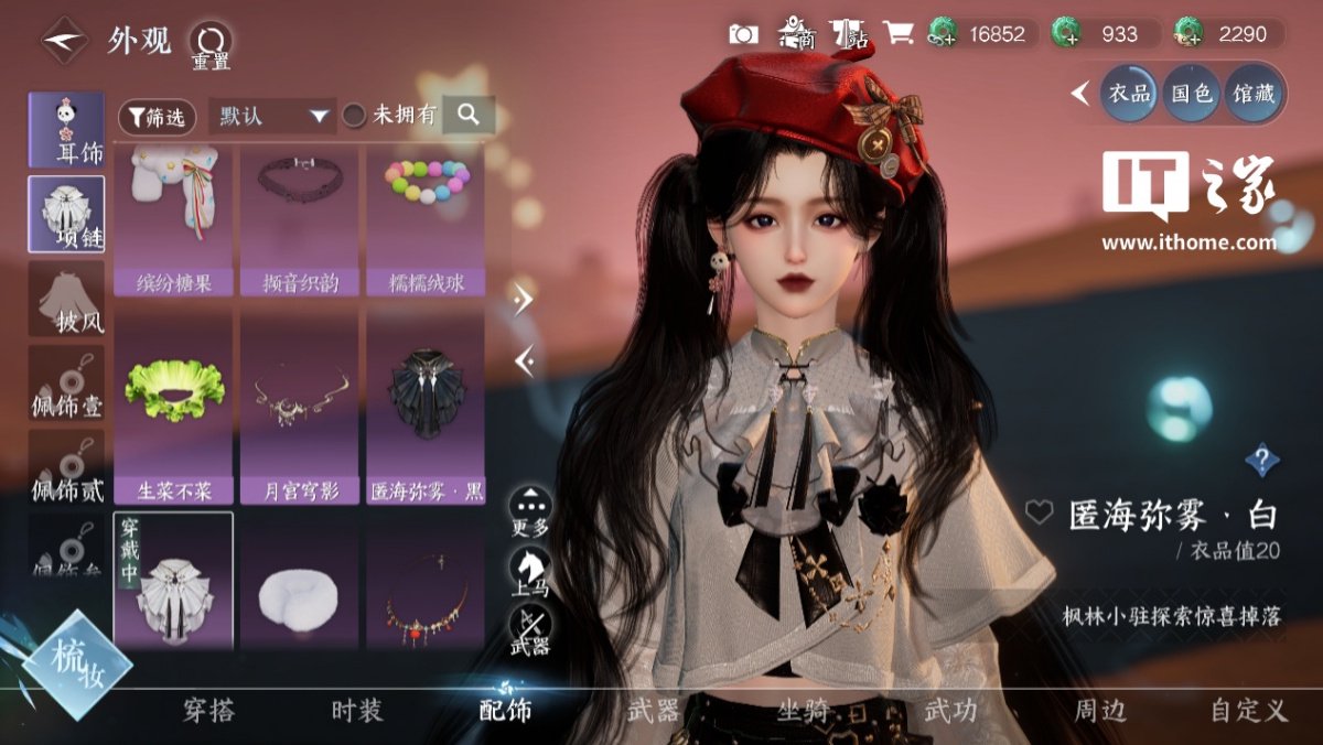 然后我果断放弃,选择找其它饰品代替。为什么要如此执着于这个首饰呢?因为原始服装不管怎么染色,也无法改变原本的图案,领口这里的白色花纹与整体风格不是很搭。经过千挑万选,我终于在已有首饰中找到了比较搭配的探索免费首饰匿海弥雾,结果效果并不完美,因为最上面一截花纹不能完美遮盖,还露出了一部分,简直逼死强迫症。