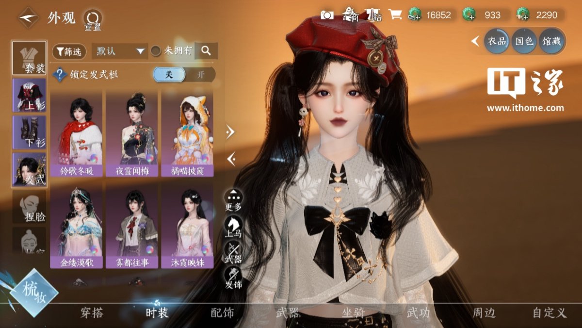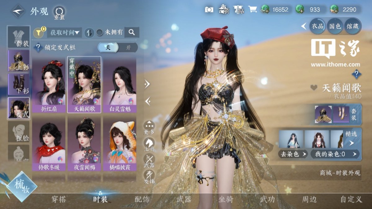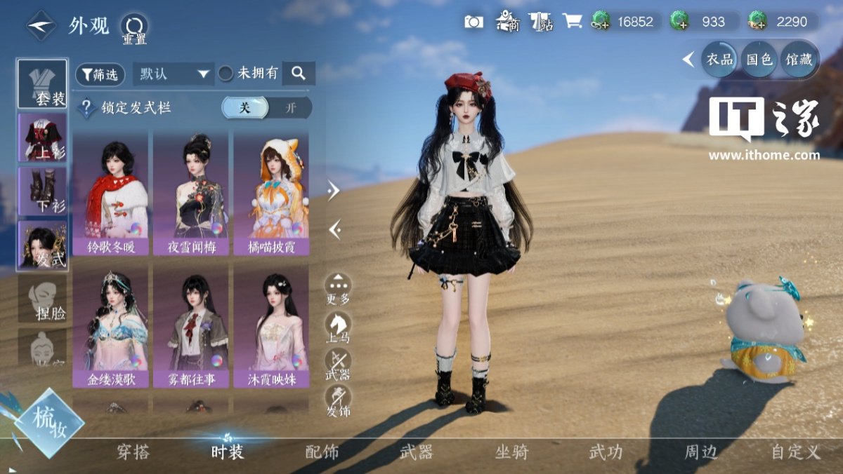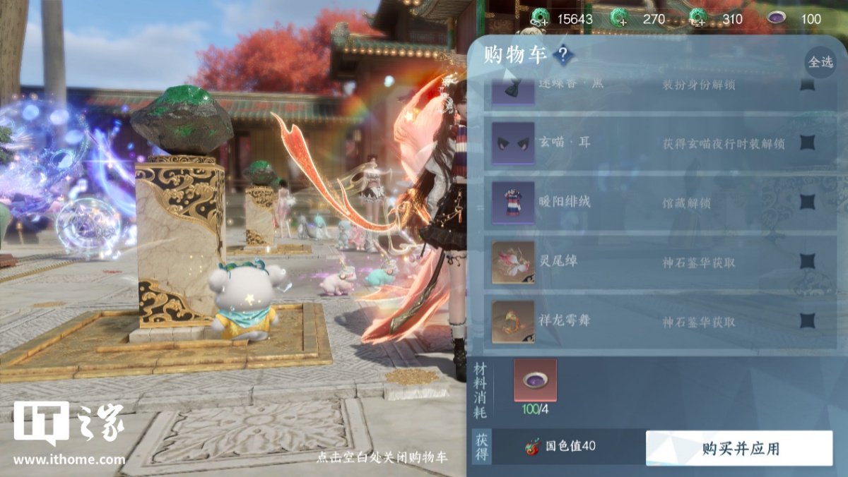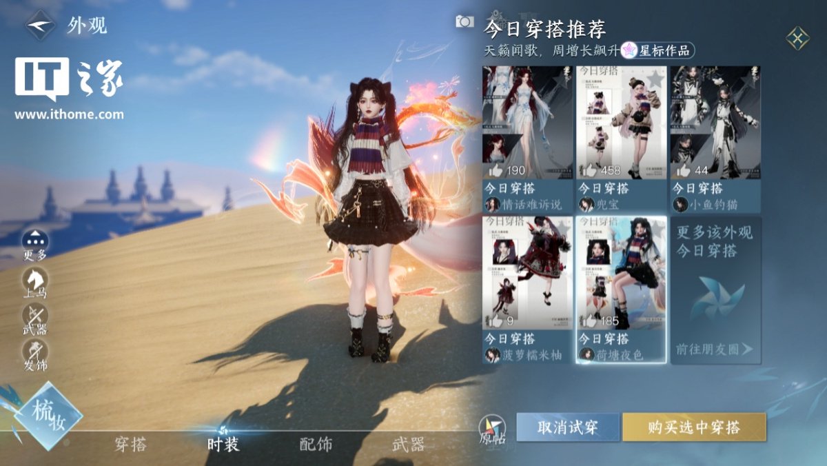 点进去后我一眼看上了这套穿搭,点击立刻就能预览上身效果,而且支持一键购买选中穿搭,没有的衣服可以买,没有的配置可以换,身份技能材料数量够就能一键应用染色效果。它省去了我大量时间不说,也不用来回切换到B站、小红书上专门看穿搭视频和教学帖,简直是懒人救星。
