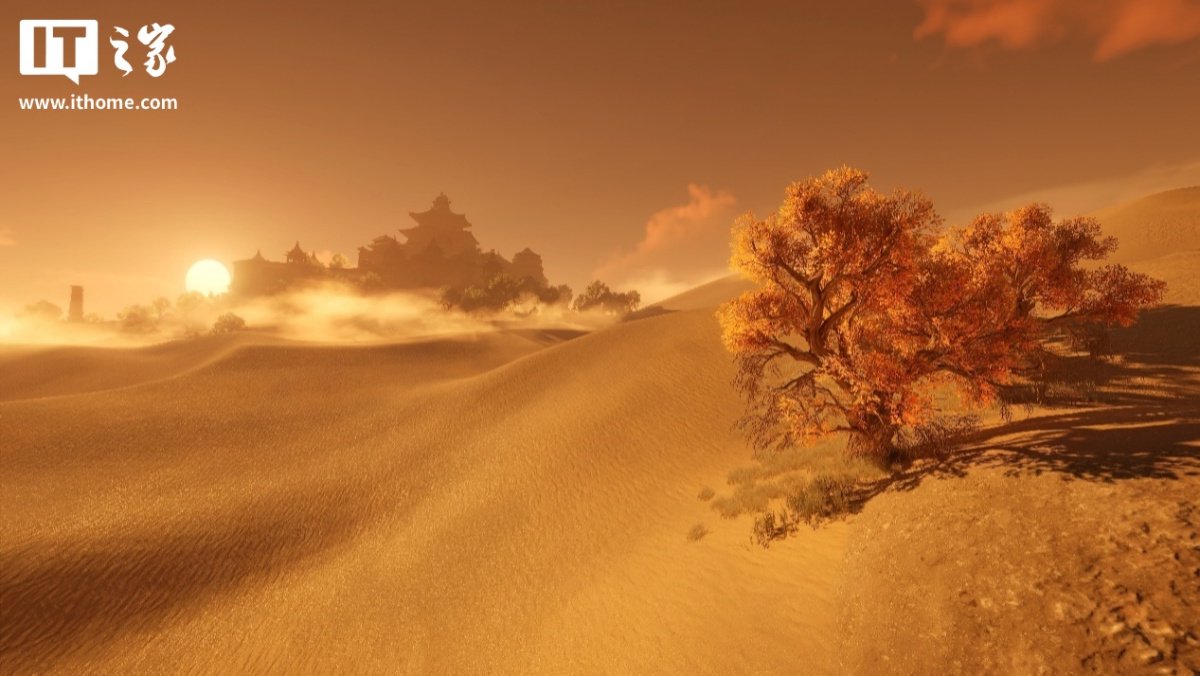 《逆水寒手游》在雾气和光影效果处理上一直很有东西,再加上远景部分在夕阳色调下会呈现出剪影效果,那种意境美得以精准表达,更是将沙漠景色的孤寂和壮阔勾勒得淋漓尽致。