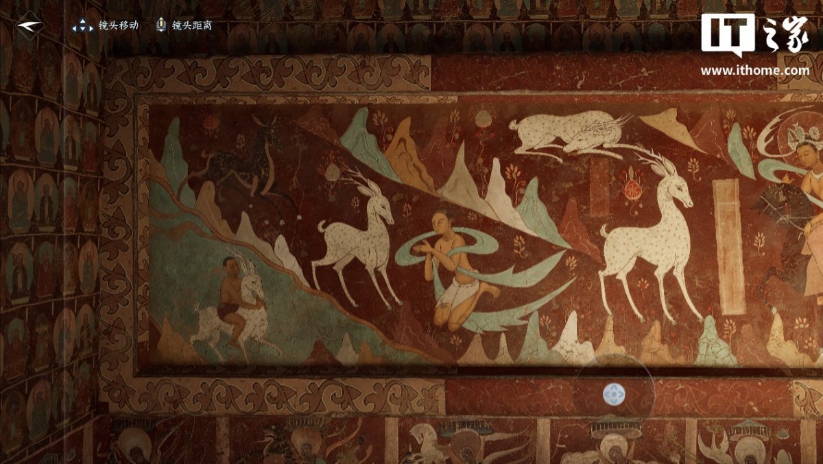 为了让玩家能够仔细品味莫高窟中的壁画,官方甚至贴心加入了最佳观景点的交互功能,来到场景中的放大镜处进行点击,摄像机立刻会以“定制”的视角展现壁画内容,玩家也能通过鼠标或手机上的按键上下左右拖动来调整壁画,相当丝滑。