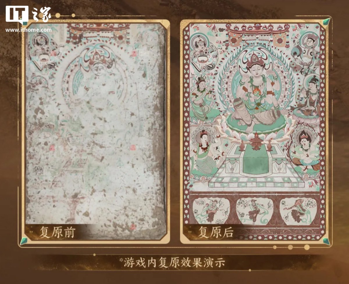 为此,《逆水寒手游》团队在敦煌内容的开发阶段,邀请到了曾参与过敦煌壁画修复工作的李晓洋老师,来担任逆水寒壁画修复顾问,也就是有专人指导进行专业还原,而不是通过不够严谨的自我“二创”。官方这次还联合了敦煌研究院一同参与游戏内容的创作,再加上制作团队的努力,最终才能将敦煌佛像、壁画和地貌之美完整呈现在游戏当中。