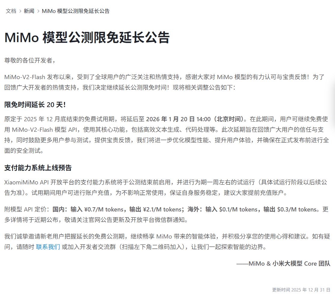 据IT之家小伙伴反馈,MiMo & 小米大模型 Core 团队今日发布公告,公测限免时间延长至 2026 年 1 月 20 日,支付系统将在公测结束前上线。