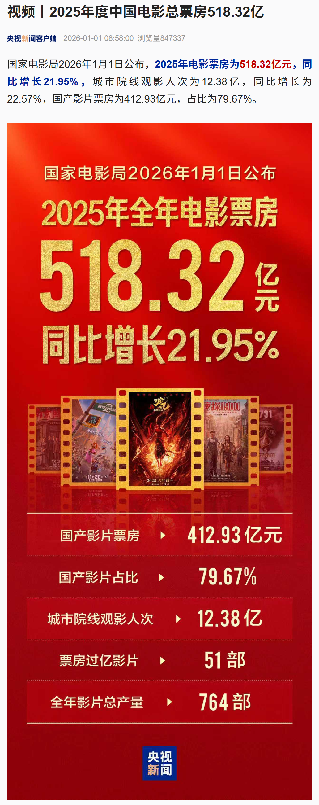 IT之家 1 月 1 日消息,据央视新闻今日报道,国家电影局 2026 年 1 月 1 日公布:2025 年电影票房为 518.32 亿元,同比增长 21.95%;城市院线观影人次为 12.38 亿,同比增长 22.57%;国产影片票房为 412.93 亿元,占比 79.67%。