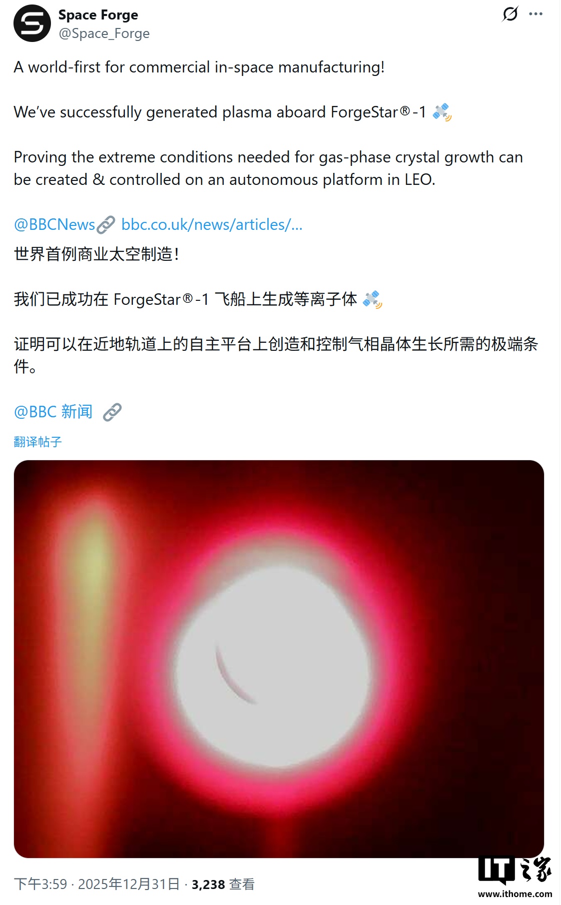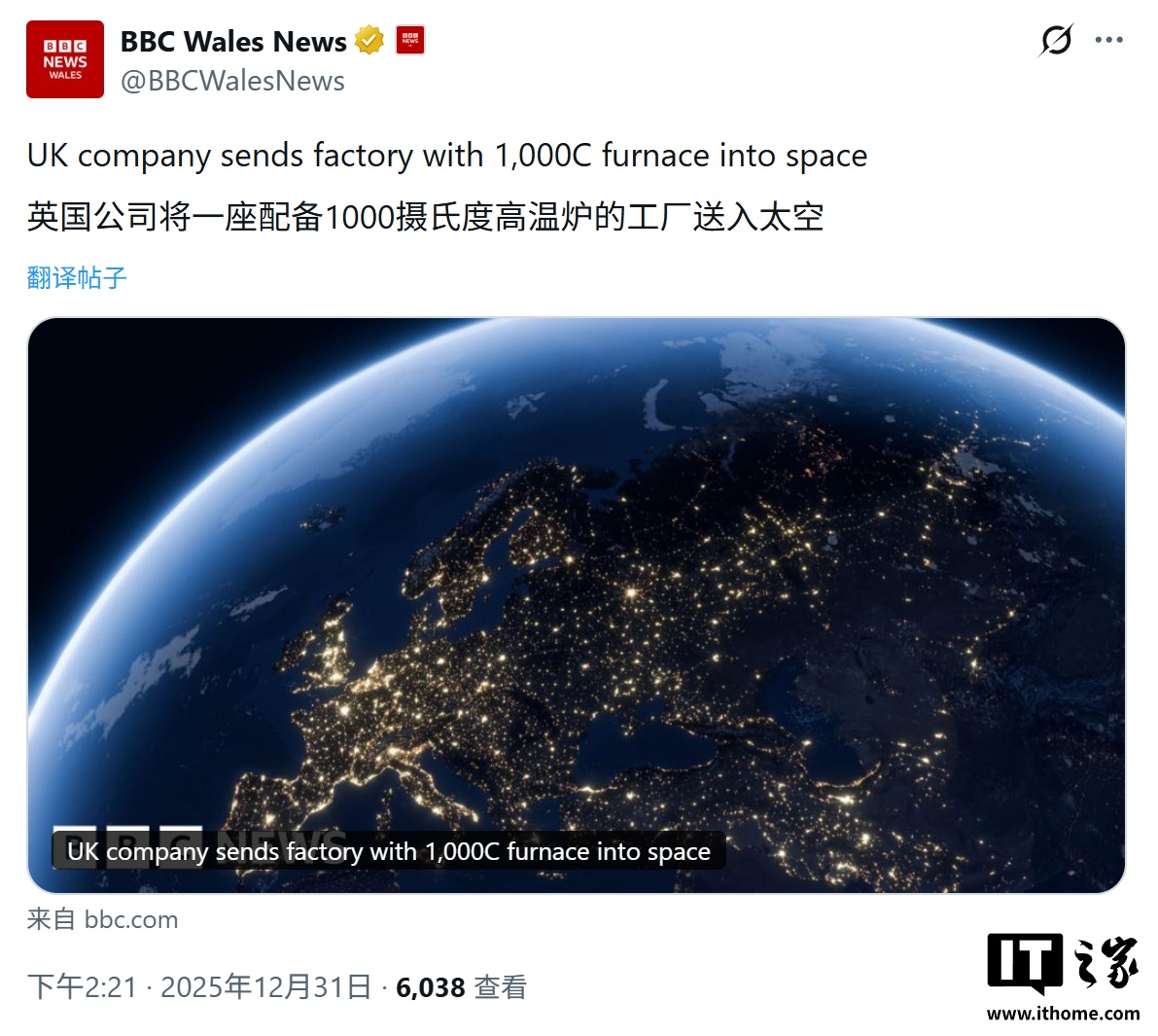 IT之家 1 月 1 日消息,英国 BBC 昨日(2025 年 12 月 31 日)报道,英国初创公司 Space Forge 成功在太空启动微波炉大小的熔炉,并让其温度达到 1000°C,成功验证“地外半导体制造”的核心工艺。