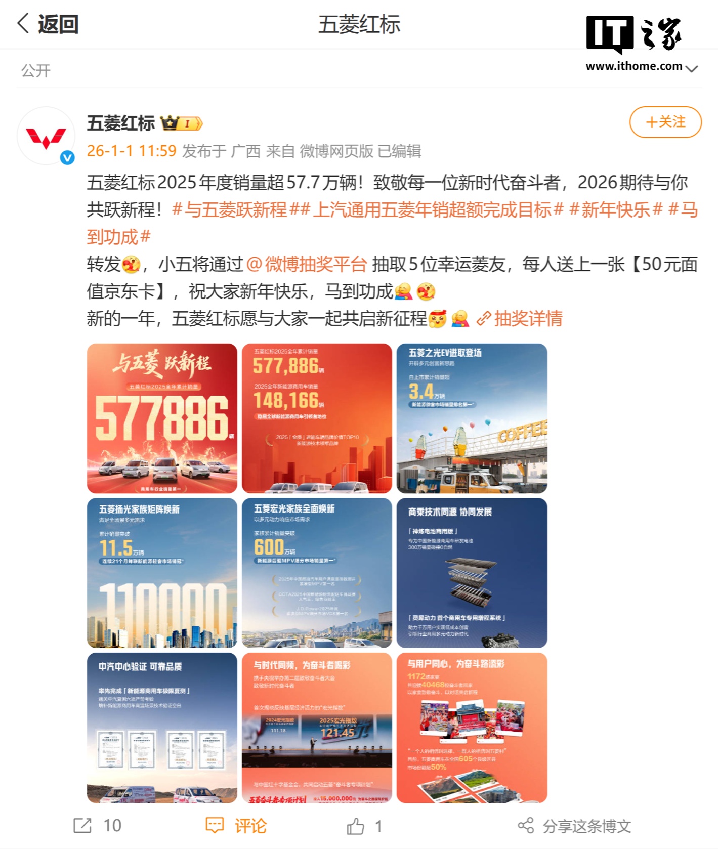 IT之家 1 月 1 日消息,“SGMW 上汽通用五菱”官方公众号今天(2026 年 1 月 1 日)发布博文,宣布 2025 年累计销量为 1635066 辆,同比增长 6.2%;其中,新能源汽车年销量 1000066 辆,年度首次突破百万大关,同比劲增 31.9%。