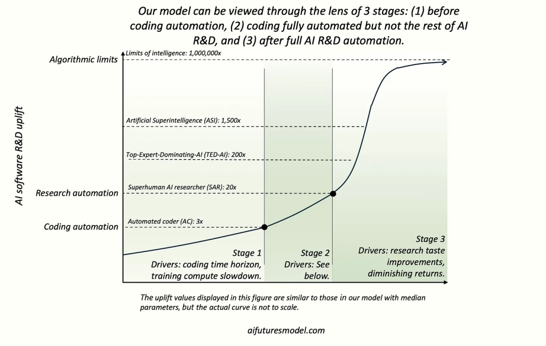 AI Futures Model 将 AI 软件研发的自动化与加速轨迹,直观地划分为三个阶段: