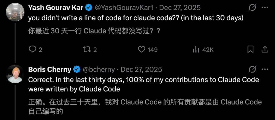 Anthropic 工程师自曝,过去一个月,自己对 Claude Code 的贡献,全部由 AI 100% 直出代码。