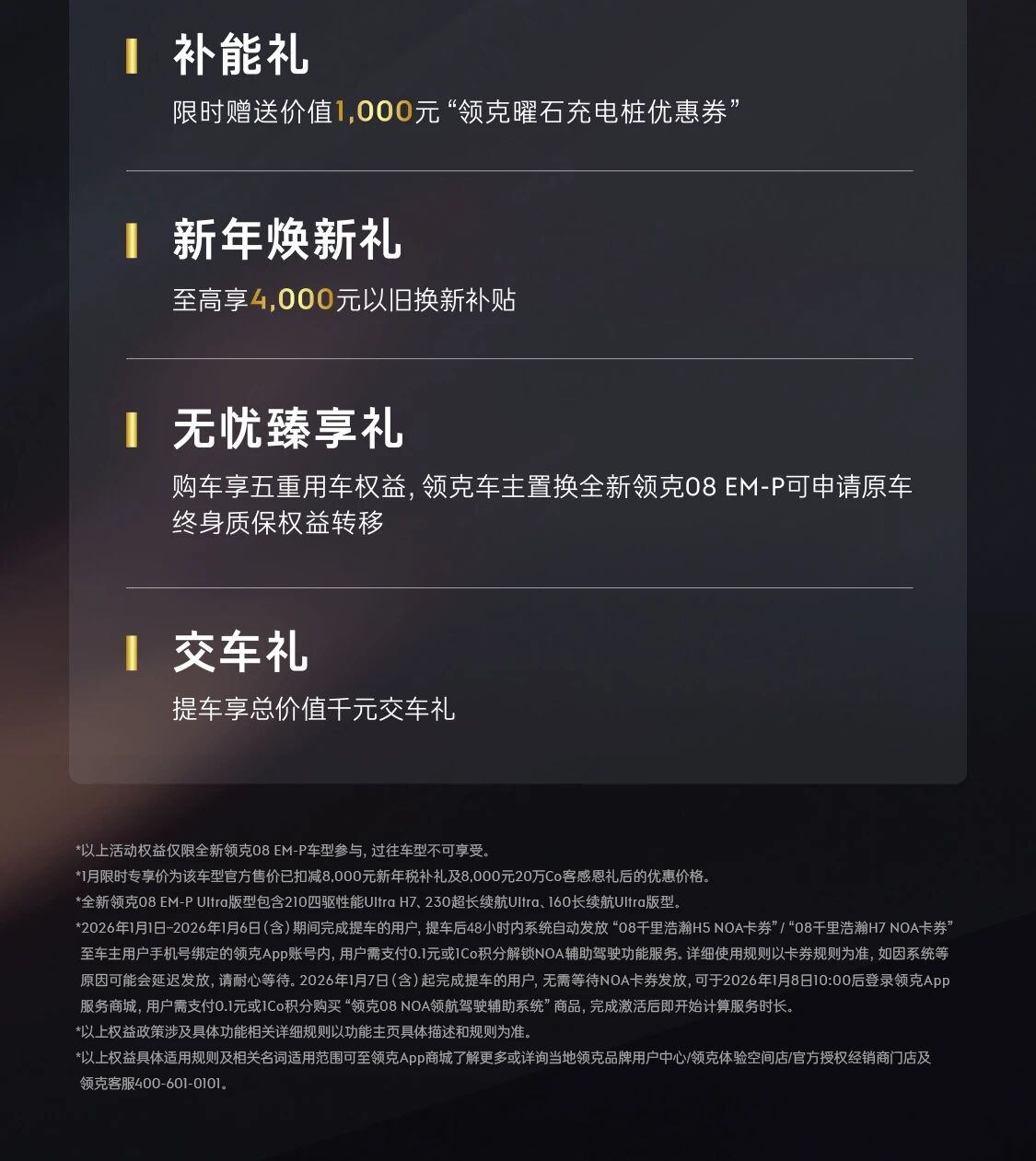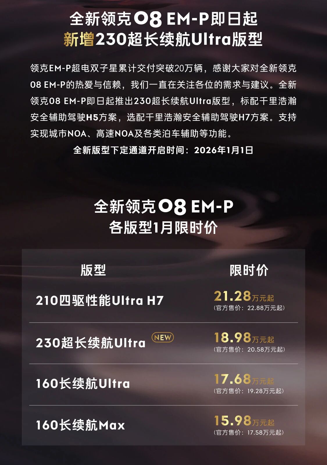 IT之家 1 月 2 日消息,领克 08 EM-P 230 超长续航 Ultra 版现已正式上市,官方售价 20.58 万元起,限时价 18.98 万元起。