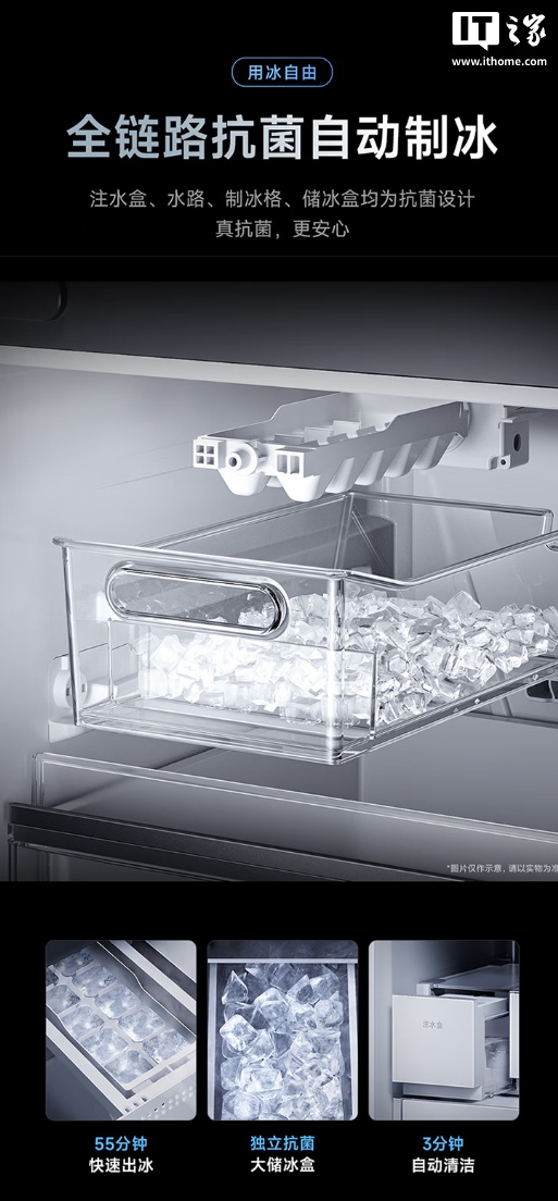 此外,这款冰箱还支持米家微冰鲜,双系统独立控温,肉类零下鲜存 10 天不冻结;支持全自动制冰,全链路抗菌认证;全域离子净化 2.0,大肠杆菌去除率超 99.999%。