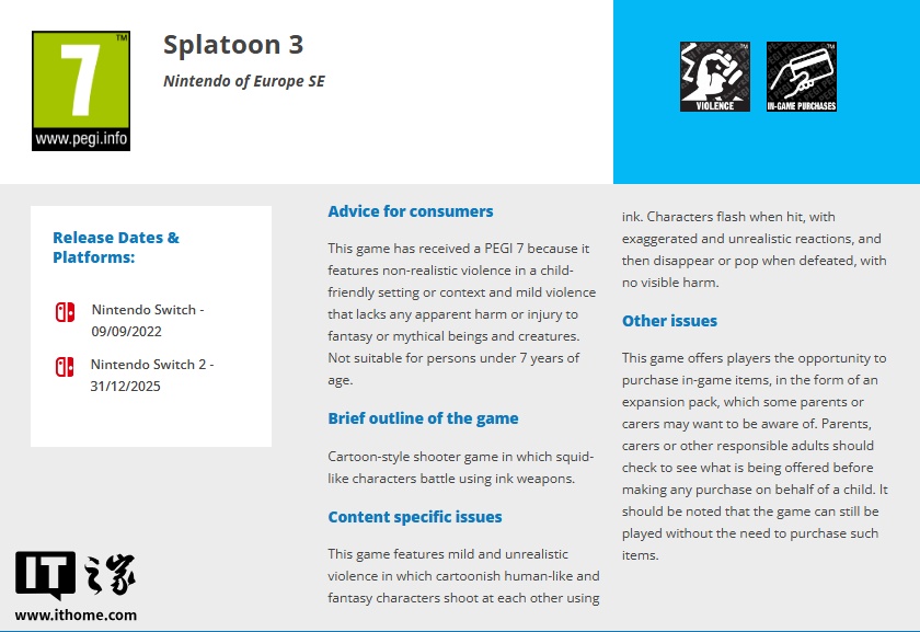 IT之家 1 月 4 日消息,欧洲游戏分级组织(PEGI)官网显示,任天堂人气射击游戏《斯普拉遁 3》,以及即时战略游戏《皮克敏 3 豪华版》已在欧洲获得 Nintendo Switch 2 版本的评级认证。