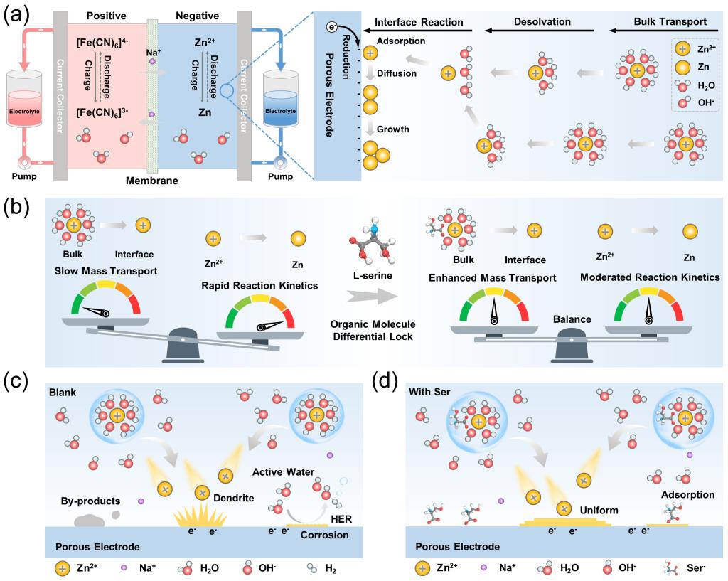 针对上述挑战,西安交通大学能动学院何雅玲院士、李印实教授科研团队创新性地提出了“有机分子差速锁”的概念,报道了一种利用 L-丝氨酸(Ser)添加剂来构建有机分子差速锁的策略。其核心设计理念在于将 Ser 作为多功能添加剂部署到负极电解液中,通过体相和界面的分区调控建立一个锌离子传输和电化学反应平衡的有利化学环境,从而实现碱性锌基液流电池的长时稳定循环。