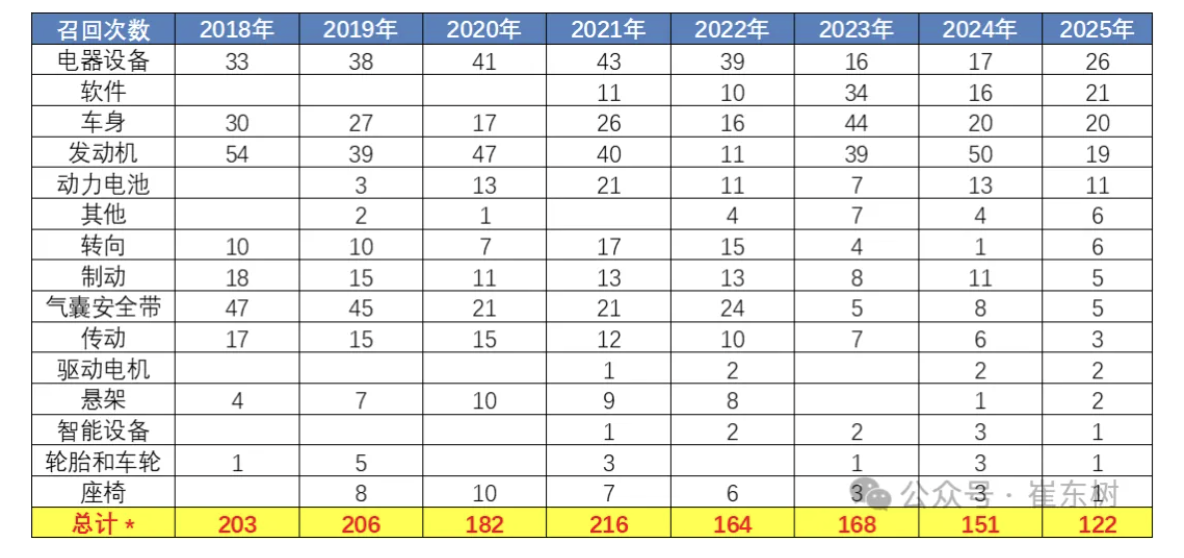 ▲ 图源崔东树(下同)崔东树表示,“目前外资企业召回次数较多,自主召回次数逐步提升。新能源车的召回数量逐步增大,电池与软件的召回日益规范。传统车召回没有出现新的趋势性事件,消费政策环境对促消费是很支持的”。
