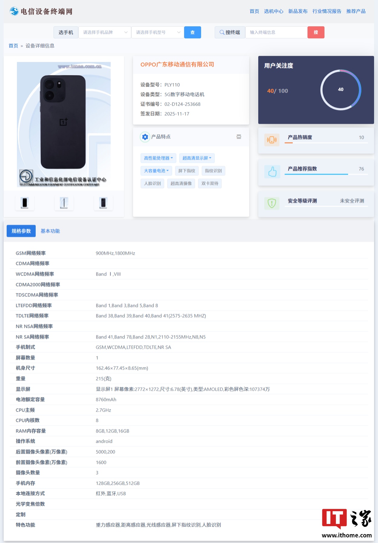 IT之家 1 月 5 日消息,型号为“PLY110”的一加新机已现身电信设备终端网,设备类型为 5G 数字移动电话机,证件照已公布。从外观和型号来看,该机预计归属 Turbo 系列,有望为一加 Turbo 6V。