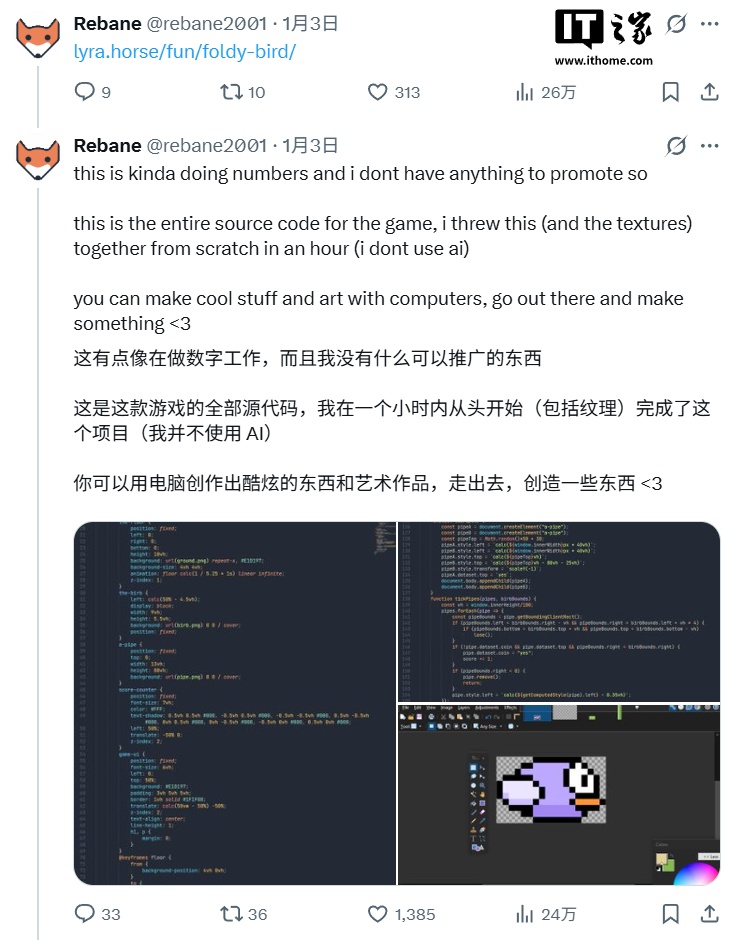 Rebane 还公布了这款游戏的游玩地址和源代码,玩家可以自行构建游戏,或者直接游玩他的版本,IT之家附地址如下: