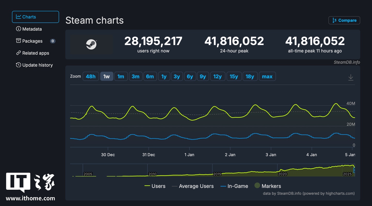 IT之家 1 月 5 日消息,SteamDB 数据显示,2026 年伊始,Steam 在线玩家峰值数迎来了新纪录,该平台近 24 小时用户在线峰值达到了 41,816,052(约 4181 万人),这与 2026 年新年假期特卖活动密不可分。