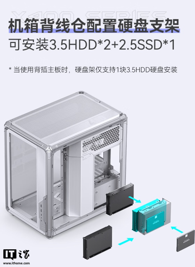硬件方面,这款机箱拥有外骨骼框架立体设计,双侧盖板均使用防跌落悬停设计,只需要按压就能开启,机箱正面 USB 接口处拥有 ARGB 灯条点缀,背仓拥有可拆卸式双理线挡板,方便玩家清灰,还带有主板辅助导风散热系统,玩家可自行将双 12cm 风扇安装到主板仓,给主板部件提供额外气流,机箱支持至多安装 2 块 3.5 英寸硬盘和 1 块 2.5 英寸硬盘。