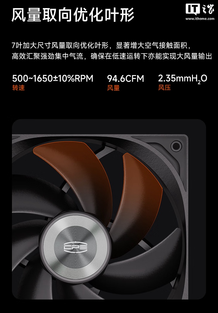 规格方面,该风扇转速范围设定在 500~1650±10% RPM,最大风量静压分别可达 94.6 CFM 和 2.35 mmH2O,供电规格为 12V/0.15A,IT之家附参数如下: