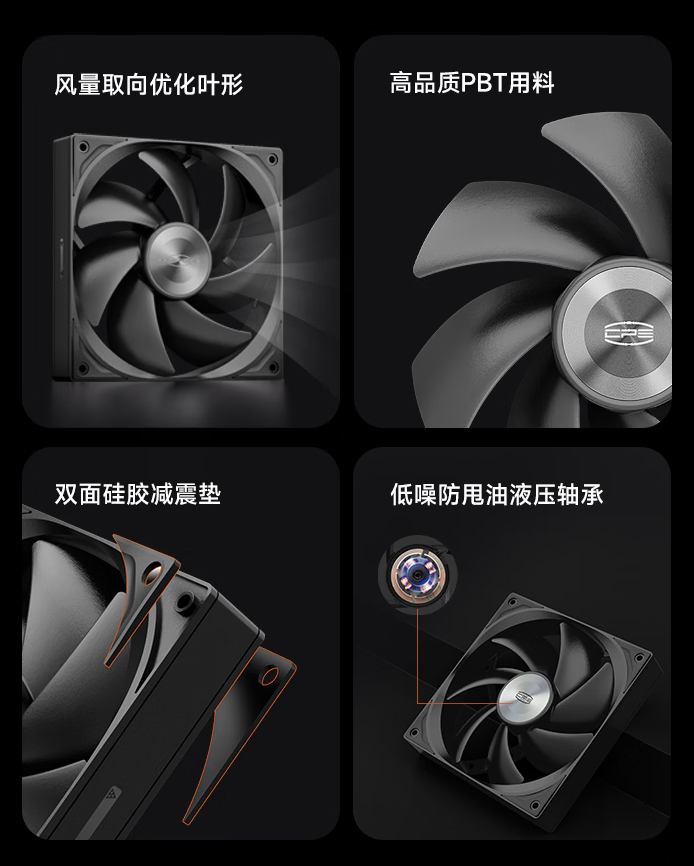 这款风扇造型简洁,采用风量取向优化叶形设计,风扇轴心提供星环金属 CD 纹理,扇叶采用加厚加强型的 PBT 材质打造,风扇内部使用低噪音防甩油液压轴承。