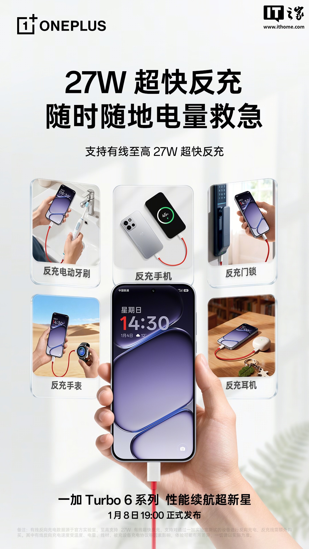 IT之家 1 月 5 日消息,一加官方今天在微博宣布,Turbo 6 系列手机将支持 27W 有线反向快充。